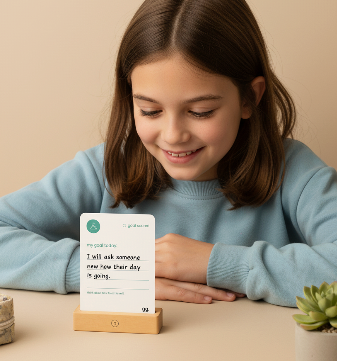 Each day, pull a card and write one specific goal for today, something simple and doable, like “raise my hand once in class” or “put my phone away at dinner.”