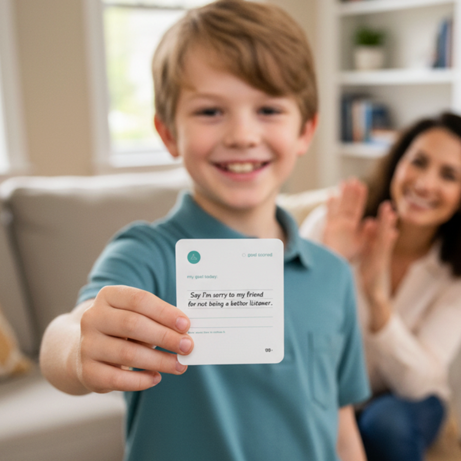 Keep the card where you can see it as a reminder. At the end of the day, check off “goal scored” and celebrate the win, no matter how small. Over time, those tiny goals add up to bigger courage, better habits, and a kid who knows they can do hard things.