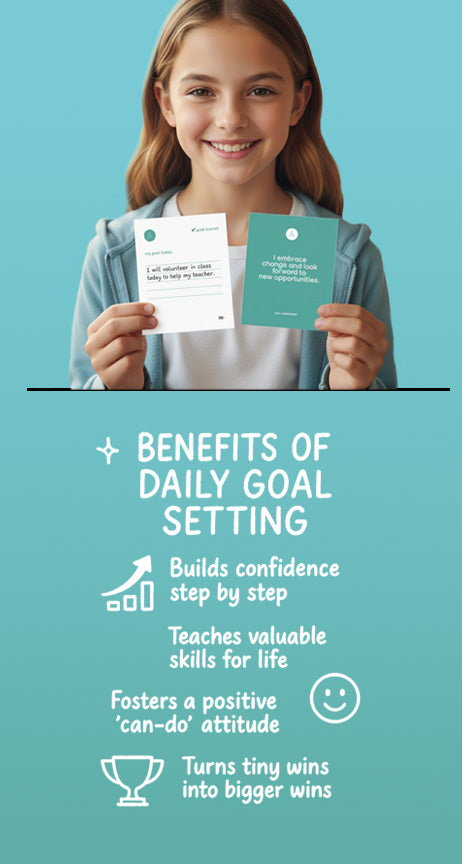 No long journals, no complicated systems. Just one clear goal a day. It’s small on purpose so kids don’t feel overwhelmed. One card, one action, one tiny step forward that keeps their brain focused on what matters.